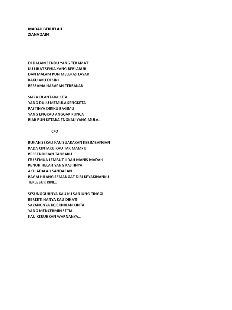 Sunday July 5 2015. Lirik Lagu Madah Berhelah - ZIANA ZAIN Di dalam sendu yang teramat Ku lihat senja yang berlabuh Dan malam yang melepas layar Kaku aku di sini Bersama harapan terbakar Siapa di antara kita Yang dulu memula sengketa Pastinya diriku bagimu Yang engkau anggap punca Biarpun ketara engkau Yang mula. Nak mimpi cuma mimpi.